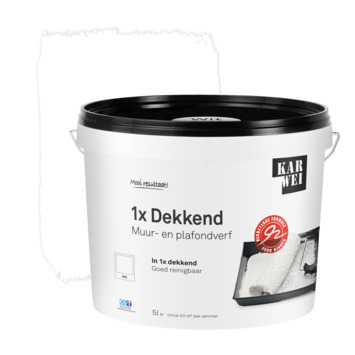 De KARWEI muur- en plafondverf 1x dekkend mat wit 5 l is een dekkende matte muurverf. Afhankelijk van de kwaliteit en de kleur van de ondergrond dekt deze verf al in één laag. De muur- en plafondverf is geschikt voor het schilderen van alle droge vertrekken binnenshuis, zoals woon-, slaapkamer, hal en dergelijke. De witte verf heeft een matte afwerking en is zeer goed reinigbaar. De verf voldoet op het gebied van dekking, witheid en reinigbaarheid aan de norm 82. 00 van het onafhankelijke keuringsinstituut COT. De emmer bevat 5 liter verf, dit is genoeg voor een oppervlakte van zo'n 40 vierkante meter. De verpakking van de verf is een ronde bak, plaats hier een rekje op en je kunt direct uit de verpakking schilderen. Gebruik voor het schilderen een vachtroller. De verf is in iedere gewenste kleur tegen meerprijs verkrijgbaar in de KARWEI bouwmarkt op de verfmengmachine.