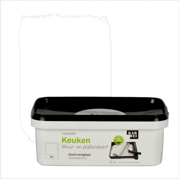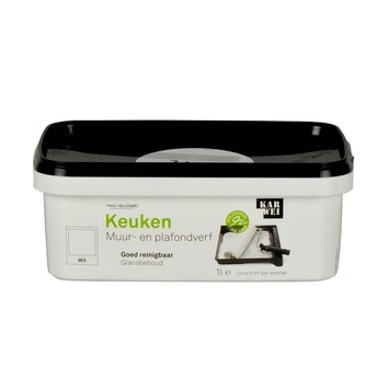 De KARWEI muur- en plafondverf keuken mat wit 1 l is een dekkende muurverf geschikt voor de keuken. De muurverf is vet-, vocht- en condensbestendig en daarmee uitstekend geschikt voor in de keuken. De verf is wit van kleur, heeft een licht zijdeglanzende afwerking en is zeer goed reinigbaar. De verpakking van de verf is een rechthoekige bakje, waardoor een rekje volstaat om direct uit de verpakking te kunnen schilderen met een blokkwast of een vachtroller. De emmer bevat 1 liter verf, dit is genoeg voor zo'n 8 vierkante meter. De verpakking van de verf is een rechthoekige bak, plaats hier een rekje op en je kunt direct uit de verpakking schilderen. Gebruik voor het schilderen een vachtroller. De verf is in vele kleuren verkrijgbaar in de KARWEI bouwmarkt op de verfmengmachine.