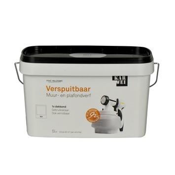 KARWEI latex verspuitbaar 1x dekkend wit 5 liter is een uitstekend dekkende verspuitbare muurverf. Afhankelijk van de kwaliteit van de ondergrond dekt deze verf in één laag. Ook de huidige kleur van de ondergrond heeft invloed of de verf in 1 laag dekt. De verf is geschikt voor het schilderen van alle droge vertrekken binnenshuis en is reinigbaar. De verf hoeft niet verdund te worden en is direct gereed om te verspuiten met de Wagner verfspuitmachines.