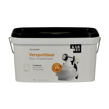 KARWEI latex verspuitbaar 1x dekkend RAL 9010 gebroken wit 10 liter is een uitstekend dekkende verspuitbare muurverf. Afhankelijk van de kwaliteit van de ondergrond dekt deze verf in één laag. Ook de huidige kleur van de ondergrond heeft invloed of de verf in 1 laag dekt. De verf is geschikt voor het schilderen van alle droge vertrekken binnenshuis en is reinigbaar. De verf hoeft niet verdund te worden en is direct gereed om te verspuiten met de Wagner verfspuitmachines.