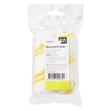 De KARWEI muur-en plafondverfroller voor ruwe ondergrond 10 cm is een vachtroller die je gebruikt voor muurverf en plafondverf op waterbasis. Met een breedte van 10 centimeter is deze roller handig voor kleinere oppervlakken zoals randen hoeken en krappe plekken. Je gebruikt deze roller op ruwe ondergronden zoals stucwerk hout of gips. De vacht is gemaakt van polyacryl wat zorgt voor een hoge verfopname en goede afgifte bij structuur in de ondergrond. In de verpakking zitten twee rollers die passen op een standaard beugel van 10 centimeter. Je kunt de roller voor gebruik een beetje nat maken en loszittende pluisjes verwijderen met een stukje tape.
