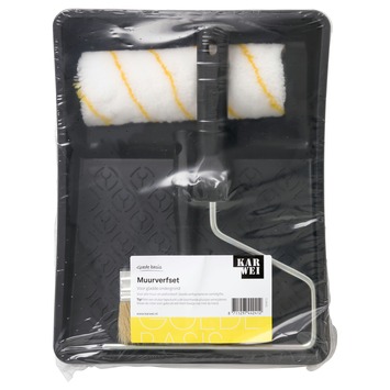 KARWEI muur-en plafondverfset 4-delig bevat een middelgrote verfbak, een losse beugel met vachtroller van 18 cm en een blokkwast. De synthetische vacht van de roller neemt muur- en plafondverf soepel op en geeft die gelijkmatig af zodat je in één streek een vlak resultaat krijgt.