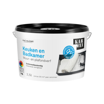 KARWEI Keuken & Badkamer muurverf is een uitstekend dekkende, matte muurverf met schimmel- en vochtbestendige eigenschap-pen. Ideaal voor muren en plafonds in vochtige ruimtes binnenshuis zoals keukens en badkamers. De verf maakt muren veelvuldig reinigbaar, is ademend, reukarm en gemakkelijk aan te brengen. Afhankelijk van de kleur en kwaliteit van de ondergrond dekt deze verf in één laag.