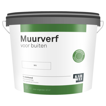 KARWEI buiten muurverf is een uitstekend dekkende, weerbestendige en matte muurverf. Ideaal voor het schilderen van buitengevels en -muren, maar ook geschikt voor binnen in vochtige ruimtes, zoals de garage en kelder. Deze verf is watergedragen, duurzaam, ademend, reukarm en schrobvast. Voor toepassing buiten- en binnenshuis. Afhankelijk van de kleur en kwaliteit van de ondergrond dekt deze verf in één laag. Is je muur nog onbehandeld? Gebruik dan voorstrijk voor een optimaal resultaat.