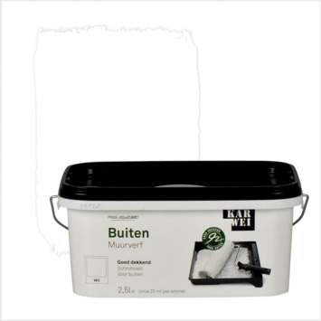 De KARWEI muurverf buiten wit mat 2,5 l is geschikt voor het schilderen van gevels en buitenmuren. De verf is weersbestendig en schrobvast en kun je ook binnenshuis gebruiken, ook in vochtige ruimtes. Zo kun je verf uitstekend gebruiken voor de badkamer, kelder of garage. De verf is wit van kleur, is dekkend en heeft een matte afwerking. De emmer bevat 2,5 liter verf, dit is genoeg voor een oppervlakte van zo'n 20 vierkante meter. De verpakking van de verf is een rechthoekige bak, plaats hier een rekje op en je kunt direct uit de verpakking schilderen. Gebruik voor het schilderen een vachtroller. De verf is in ieder gewenste kleur verkrijgbaar in de KARWEI bouwmarkt op de verfmengmachine.