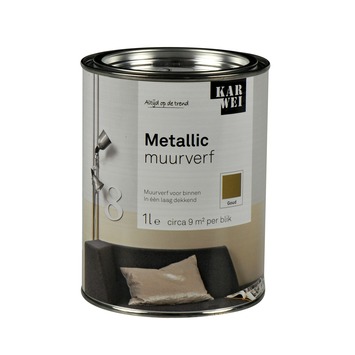 De KARWEI muurverf hoogglans metallic goud 1 l is een dekkende, hoogglanzende muurverf. De verf is speciaal bedoeld voor een decoratieve afwerking met metallic effect. De verf is enkel geschikt voor toepassingen binnenshuis. Je kunt het eenvoudig met een kwast of roller aanbrengen. De muurverf op waterbasis droogt snel en is reukarm. Het blik bevat 1 liter gouden verf, dit is genoeg voor een oppervlakte van zo'n 9 vierkante meter. Tip: voor een egaal effect rol je de verf uit in één richting, voor een wild effect rol je de verf uit in alle richtingen. De metallic muurverf is ook kant en klaar verkrijgbaar in de kleur zilver, maar je kunt de verf ook in vele andere kleuren verkrijgen in de KARWEI bouwmarkt op de verfmengmachine.