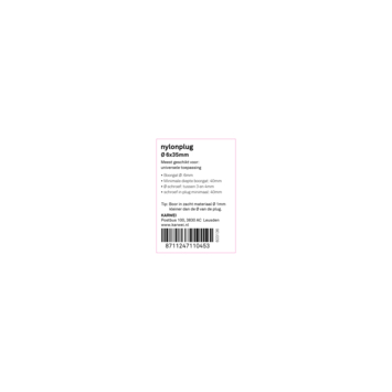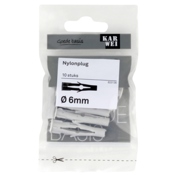 De KARWEI nylonplug Ø 6mm is voor meerdere materialen te gebruiken De plug is zowel geschikt voor beton, massieve als geperforeerde steen, en ook voor holle wanden. De kop van de plug wordt namelijk door de schroef naar achteren getrokken en vormt in holle bouwmaterialen een soort knoop. Een handige plug dus om op voorraad te hebben, zodat je altijd een geschikte plug in huis hebt. De plug is 35mm lang, voor het beste resultaat adviseren wij een minimale boordiepte te hanteren van 40mm . Een verpakking bevat 10 pluggen. Deze plug is geschikt voor schroeven tussen 3 en 4mm met een minimale lengte van 40mm