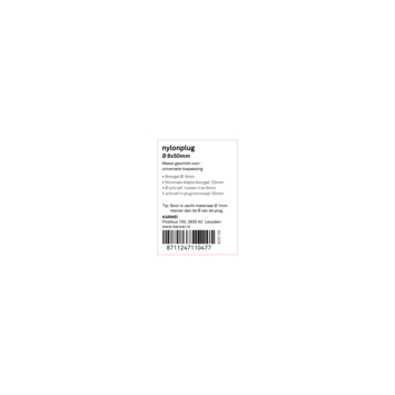 De KARWEI nylonplug Ø 8mm is voor meerdere materialen te gebruiken De plug is zowel geschikt voor beton, massieve als geperforeerde steen, en ook voor holle wanden. De kop van de plug wordt namelijk door de schroef naar achteren getrokken en vormt in holle bouwmaterialen een soort knoop. Een handige plug dus om op voorraad te hebben, zodat je altijd een geschikte plug in huis hebt. De plug is 50mm lang, voor het beste resultaat adviseren wij een minimale boordiepte te hanteren van 55mm . Een verpakking bevat 8 pluggen. Deze plug is geschikt voor schroeven tussen 4 en 6mm met een minimale lengte van 55mm