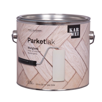 De KARWEI parketlak mat kleurloos 2,5 l is geschikt voor het duurzaam beschermen van parketvloeren en houten vloeren. De lak is een transparant, waardoor de houtnerven van je vloer zichtbaar blijven en heeft een matte afwerking. Deze lak op waterbasis droogt snel en is reukarm. Je kunt de lak al na 4 uur overschilderen, met eventuele een volgende laklaag. Je kunt de lak eenvoudig met een kwast of roller aanbrengen. Het blik bevat 2,5 liter kleurloze lak, dit is goed voor een oppervlakte van zo'n 30 vierkante meter. De lak is ook geschikt voor het beschermen van plinten, deuren en meubels en is ook beschikbaar in een zijdeglanzende variant.