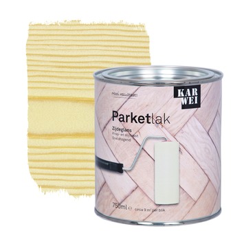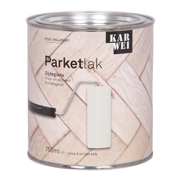 De KARWEI parketlak zijdeglans kleurloos 750 ml is geschikt voor het duurzaam beschermen van parketvloeren en houten vloeren. De lak is een transparant, waardoor de houtnerven van je vloer zichtbaar blijven en heeft een zijdeglanzende afwerking. Deze lak op waterbasis droogt snel en is reukarm. Je kunt de lak al na 4 uur overschilderen, met eventuele een volgende laklaag. Je kunt de lak eenvoudig met een kwast of roller aanbrengen. Het blik bevat 750 milliliter kleurloze lak, dit is goed voor een oppervlakte van zo'n 9 vierkante meter. De lak is ook geschikt voor het beschermen van plinten, deuren en meubels en is ook beschikbaar in een zijdeglanzende variant.