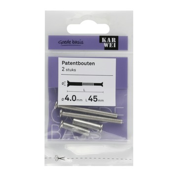 Vernikkelde patentbout. Deze bout wordt veelal gebruikt voor het bevestigen van deurbeslag bij holle deuren of voor het koppelen van meubelen.