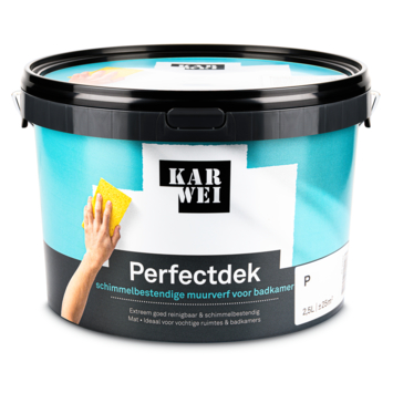 Karwei Perfectdek Badkamer schimmelbestendig mengbare muurverf mat 2,5 liter is gemaakt voor muren die te maken krijgen met vocht en temperatuurschommelingen. De verf vormt een beschermende laag op de muur die helpt om schimmelvorming tegen te gaan. Daardoor blijft de afwerking langer intact, ook bij intensief gebruik in de badkamer.