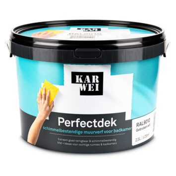 Karwei Perfectdek Badkamer schimmelbestendig muurverf RAL 9010 mat 2,5 liter is speciaal ontwikkeld voor muren in vochtige ruimtes. In de badkamer, waar condens en temperatuurschommelingen voorkomen, vormt de verf een beschermende laag die helpt om schimmelvorming tegen te gaan. Zo blijft de afwerking langer intact, ook bij dagelijks gebruik.