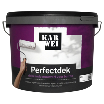 KARWEI Perfectdek muur en gevel mat buiten wit 10 liter is een uitstekend dekkende, weerbestendige en matte verf. Ideaal voor het schilderen van buitengevels en muren. De schimmelwerende ingrediënten van de verf zorgen voor een beschermende laag die de muur beschermt tegen weersinvloeden, algen- en schimmelaantasting. KARWEI Perfectdek buiten is In elke gewenste kleur te mengen. Is je muur nog onbehandeld? Gebruik dan eerst KARWEI dekkend voorstrijk binnen-buiten voor een optimaal resultaat.