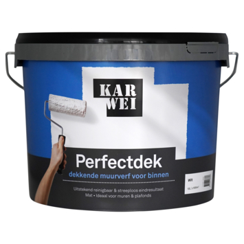 KARWEI Perfectdek muur en plafondverf mat binnen wit 10 liter is de beste keuze voor een strak en egaal eindresultaat. KARWEI Perfectdek is een optimaal dekkende, afneembare (schrobklasse 2) en matte muurverf. Universeel toepasbaar voor muren en plafonds in droge ruimtes binnenshuis zoals de woon of slaapkamer. De KARWEI Perfectdek heeft altijd een strak en steeploos eindresultaat. Verfbanen en strepen vloeien tijdens het drogen naadloos in elkaar over. Afhankelijk van kleur en kwaliteit van de ondergrond dekt deze verf in één laag. Bij donkere of felle kleuren heb je meer verflagen nodig voor een optimale dekking. KARWEI Perfectdek is beschikbaar in de kleuren Wit, RAL 9010 Gebroken wit en RAL 9016 Verkeerswit.