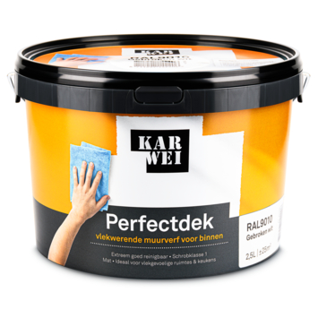 Karwei Perfectdek vlekwerend muurverf RAL 9010 mat 2,5 liter is geschikt voor binnenmuren die regelmatig vuil worden, zoals in de keuken of andere intensief gebruikte ruimtes. De verf zorgt ervoor dat vlekken minder snel in de muur trekken. Daardoor blijft het oppervlak langer netjes en hoef je minder snel opnieuw te schilderen.