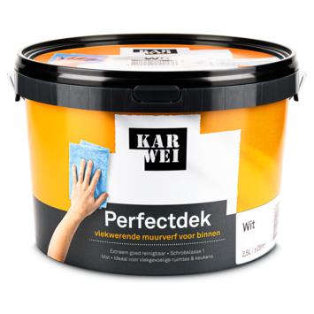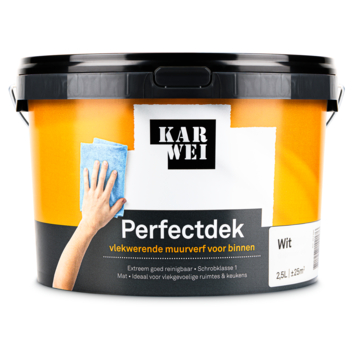 Karwei Perfectdek vlekwerend muurverf wit 2,5 liter is ontwikkeld voor binnenmuren die vaak vuil worden, zoals in de keuken of andere druk gebruikte ruimtes. Vlekken trekken minder snel in de verflaag, waardoor je muur langer schoon oogt en de afwerking beter behouden blijft.