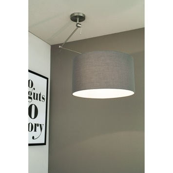 De KARWEI hanglamp Lukas grijs is een mooie en praktische hanglamp voor boven je eettafel. Deze lamp is afgewerkt met een mooie, stoffen kap in de kleur grijs. De lamp is gemakkelijk te verplaatsen door de beugel en heeft een diffuserplaat, waardoor er mooi indirect licht doorheen schijnt.