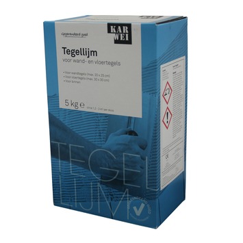 De KARWEI poeder tegellijm is gemakkelijk aan te maken met leidingwater en kan binnen worden toegepast. De lijm is geschikt voor het verlijmen van keramische wandtegels van max. 20x25 cm en vloertegels van max. 30x30 cm op verschillende ondergronden. Deze verpakking heeft een inhoud van 5 kg wat voldoende is voor ongeveer 1,2 tot 2 m2.