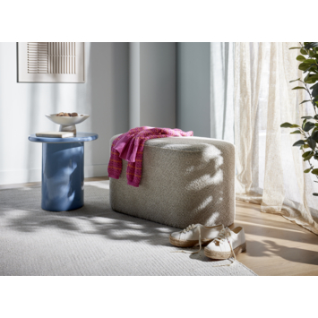 Met een zithoogte van 43 cm en een zitbreedte van 80 cm biedt de poef een aangename zitervaring. De stevige constructie en hoogwaardige stof maken Eveline geschikt voor dagelijks gebruik. Het neutrale beige maakt de poef eenvoudig te combineren met diverse kleuren en materialen, zodat hij altijd een passende plek in jouw interieur vindt. Dankzij de compacte afmetingen is hij bovendien makkelijk te verplaatsen, ideaal wanneer je jouw woonruimte snel een nieuwe indeling wilt geven.