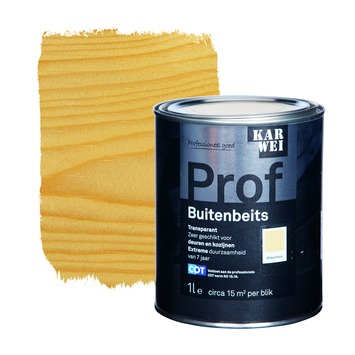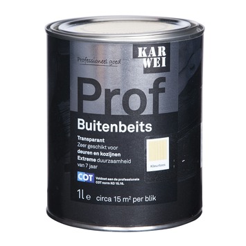 De KARWEI Prof buitenbeits kleurloos transparant 1 l is ideaal voor langdurige bescherming van hoogwaardig hout. Door de toevoeging van siliconen en andere zeer hoogwaardige grondstoffen kan een duurzaamheid van 7 jaar worden gegarandeerd. Hierdoor is de beits geschikt voor buitendeuren en buitenkozijnen maar ook voor daklijsten en gevelbetimmeringen. Deze glanzende beits is weersbestendig, waterafstotend, UV-bestendig en vochtregulerend. Het blik bevat 1 liter transparante kleurloze beits. Dit is goed voor het beitsen van zo'n 15 vierkante meter. Grondverf is niet nodig en je kunt de beits eenvoudig met een kwast of roller aanbrengen. Op onbehandeld hout is het aan te bevelen om 3 lagen aan te brengen, op hout in goede staat volstaan 2 lagen. De KARWEI Profbeits voldoet aan de Professionele norm van het onafhankelijke keuringsinstituut COT.