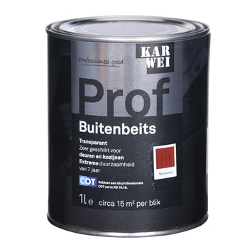 De KARWEI Prof buitenbeits mahonie transparant 1 l is ideaal voor langdurige bescherming van hoogwaardig hout. Door de toevoeging van siliconen en andere zeer hoogwaardige grondstoffen kan een duurzaamheid van 7 jaar worden gegarandeerd. Hierdoor is de beits geschikt voor buitendeuren en buitenkozijnen maar ook voor daklijsten en gevelbetimmeringen. Deze glanzende beits is weersbestendig, waterafstotend, UV-bestendig en vochtregulerend. Het blik bevat 1 liter transparante beits in mahonie kleur. Dit is goed voor het beitsen van zo'n 15 vierkante meter. Grondverf is niet nodig en je kunt de beits eenvoudig met een kwast of roller aanbrengen. Op onbehandeld hout is het aan te bevelen om 3 lagen aan te brengen, op hout in goede staat volstaan 2 lagen. De KARWEI Profbeits voldoet aan de Professionele norm van het onafhankelijke keuringsinstituut COT.