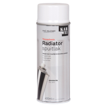 De KARWEI radiator spuitlak hoogglans gebroken wit 400 ml is een warmtebestendige glanzende lak voor het afwerken van radiatoren en verwarmingsbuizen. De lak verkleurd niet en is eenvoudig te verspuiten. De spuitbus bevat 400 milliliter gebroken witte spuitlak, dit is genoeg voor een oppervlakte van 4 vierkante meter. De spuitlak is ook verkrijgbaar in wit en lichtgrijs.