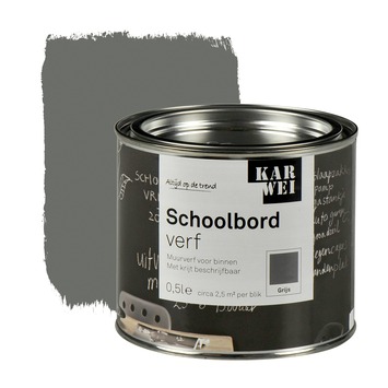 De KARWEI schoolbordverf mat grijs 500 ml is een schoolbordverf die goed beschrijfbaar is met krijt. De verf is geschikt voor muren en houten oppervlakken, zoals deuren en kasten. De verf is enkel geschikt voor toepassingen binnenshuis. Je kunt de verf eenvoudig met een kwast of roller aanbrengen. De verf op waterbasis droogt snel en is reukarm is. Het blik bevat 500 milliliter grijze verf, dit is genoeg voor een oppervlakte van zo'n 5 vierkante meter wanneer je één laag aanbrengt. Voor een goed beschrijfbaar bord zijn echter minimaal 2 lagen vereist. Tip: gebruik KARWEI magneetverf als onderlaag, zo maak je van je schoolbord ook een memobord. De schoolbordverf is ook kant en klaar verkrijgbaar in zwart, blauw en roze. In de KARWEI bouwmarkt is de verf in nog meer kleuren verkrijgbaar op de verfmengmachine.