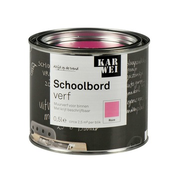 De KARWEI schoolbordverf mat roze 500 ml is een schoolbordverf die goed beschrijfbaar is met krijt. De verf is geschikt voor muren en houten oppervlakken, zoals deuren en kasten. De verf is enkel geschikt voor toepassingen binnenshuis. Je kunt de verf eenvoudig met een kwast of roller aanbrengen. De verf op waterbasis droogt snel en is reukarm is. Het blik bevat 500 milliliter roze verf, dit is genoeg voor een oppervlakte van zo'n 5 vierkante meter wanneer je één laag aanbrengt. Voor een goed beschrijfbaar bord zijn echter minimaal 2 lagen vereist. Tip: gebruik KARWEI magneetverf als onderlaag, zo maak je van je schoolbord ook een memobord. De schoolbordverf is ook kant en klaar verkrijgbaar in zwart, grijs en blauw. In de KARWEI bouwmarkt is de verf in nog meer kleuren verkrijgbaar op de verfmengmachine.