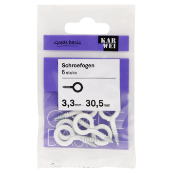 Op zoek naar een witte schroefoog? Met deze haak met gesloten oog voor bevestiging in hout of steen, beton in combinatie met een plug kan dat. Met de KARWEI Schroefogen wit 3,3mm - 30,5mm 6 stuks voltooi je de klus in een handomdraai.