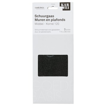 Je maakt muren en plafonds glad met het KARWEI schuurgaas muur en plafond K120. Deze set bestaat uit drie vellen met een afmeting van 11,5 bij 28 centimeter. Je gebruikt dit schuurgaas als je bijvoorbeeld gipsplaten, gasbetonblokken of pleisterwerk wilt voorbereiden op schilderen of behangen. Dankzij de middelgrove korrel 120 kun je kleine oneffenheden eenvoudig wegschuren. Het gaas werkt aan twee kanten en is geschikt voor zowel droog als nat schuren.