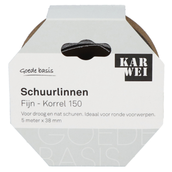 KARWEI schuurlinnen fijn 5 m is een rol sterk schuurlinnen van het KARWEI-eigen merk waarmee je hout, kunststof, ferro- en non-ferrometalen droog of nat schaaft. Op de 5 meter lange strook en 115 mm brede ondergrond buig je het materiaal moeiteloos om rondingen en lastig bereikbare hoeken zodat elke kromming netjes glad wordt. Het fijne schuuroppervlak pakt kleine krasjes en ruwe plekken snel aan. Door de krachtige kwaliteit knip je precies de lengte af die je nodig hebt zonder dat het lint scheurt. Zo werk je efficiënt en voorkom je verspilling. Of je nu een ronde trapleuning klaarmaakt of metalen onderdelen ontroest, met dit schuurlinnen houd je je klus vlot en netjes.