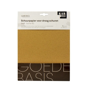 Het KARWEI schuurpapier droog 230x280mm grof 5 stuks is schuurpapier van het KARWEI eigen merk. Het schuurpapier is met name geschikt voor het handmatig of machinaal schuren van onbehandeld hout en het verwijderen van oude verf- en laklagen. De set bevat 5 schuurvellen met een grove korrel (K60) en een afmeting van 23 x 28 centimeter.