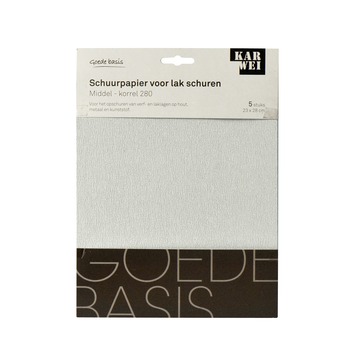 Het KARWEI schuurpapier lak 230x280mm middel 5 stuks is schuurpapier van het KARWEI eigen merk. Het schuurpapier is met name geschikt voor het handmatig of machinaal opschuren van verf- en laklagen op hout, metaal en kunststof. De set bevat 5 schuurvellen met een middel fijne korrel (K280) en een afmeting van 23 x 28 centimeter.