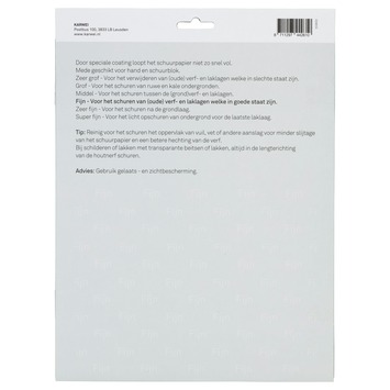 - Verpakking bevat 3 vellen fijne korrel (K180) van 23x28cm