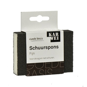 De KARWEI schuurspons fijn is een schuurspons van het KARWEI eigen merk. De schuurspons fijn is geschikt voor nabewerking van reeds geschuurde houten of metalen ondergronden. De schuurspons vormt zich naar het te schuren oppervlak, wat betekent dat ongelijke oppervlakken zoals radiatoren of geprofileerd meubilair goed behandeld kan worden. De spons kan zowel nat als droog gebruikt worden, is uitwasbaar en herbruikbaar. De schuurspons heeft een afmeting van 10 x 7 centimeter.