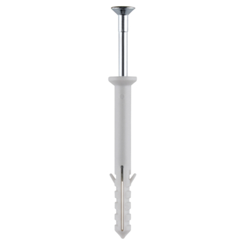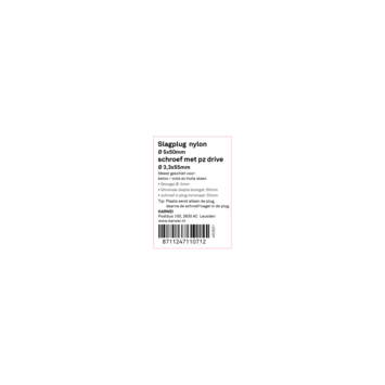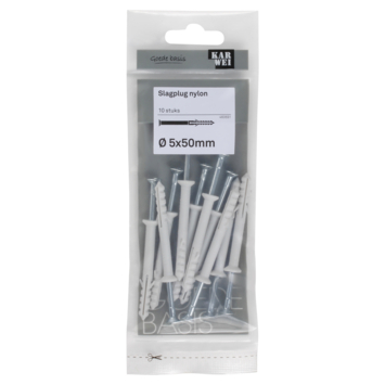 De KARWEI Slagplug nylon Ø 5x50mm met schroef is geschikt voor toepassing op verschillende soorten materialen zoals beton, wandverbinding en metaal. Nagelpluggen zijn zeer geschikt voor het monteren van houten regelwerk (zoals plinten). De werkwijze is anders dan bij een gewone plug en daarom is deze plug ook wel bekend als spijkerplug of nagelplug. Je slaat de plug namelijk met een hamer in het boorgat. Gebruik voor het boren van het gat een boor met een doorsnede van 5mm. De plug is 50mm lang. Bijpassende schroeven zijn 55mm lang en hebben een doorsnede van Ø 3,3 mm. Een verpakking bevat 10 slagpluggen.