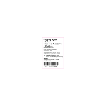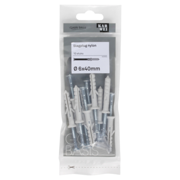 De KARWEI Slagplug nylon Ø 6x40mm met schroef is geschikt voor toepassing op verschillende soorten materialen zoals beton, wandverbinding en metaal. Nagelpluggen zijn zeer geschikt voor het monteren van houten regelwerk (zoals plinten). De werkwijze is anders dan bij een gewone plug en daarom is deze plug ook wel bekend als spijkerplug of nagelplug. Je slaat de plug namelijk met een hamer in het boorgat. Gebruik voor het boren van het gat een boor met een doorsnede van 6mm. De plug is 40mm lang. Bijpassende schroeven zijn 45mm lang en hebben een doorsnede van Ø 3,7 mm. Een verpakking bevat 10 slagpluggen.