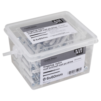 De KARWEI Slagplug nylon Ø 6mm met schroef is geschikt voor toepassing op verschillende soorten materialen zoals beton, wandverbinding en metaal. Nagelpluggen zijn zeer geschikt voor het monteren van houten regelwerk (zoals plinten). De werkwijze is anders dan bij een gewone plug en daarom is deze plug ook wel bekend als spijkerplug of nagelplug. Je slaat de plug namelijk met een hamer in het boorgat. Gebruik voor het boren van het gat een boor met een doorsnede van 6mm. De plug is 60mm lang. Bijpassende schroeven zijn 65mm lang en hebben een doorsnede van Ø 3,7 mm. Een verpakking bevat 100 slagpluggen.