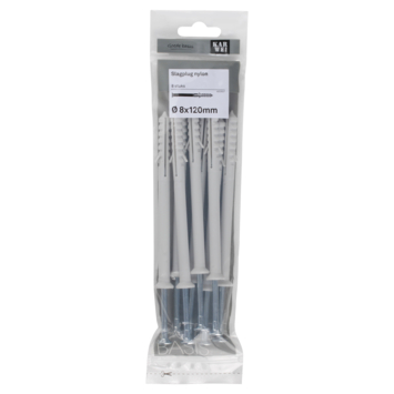 De KARWEI Slagplug nylon Ø 8x120mm met schroef is geschikt voor toepassing op verschillende soorten materialen zoals beton, wandverbinding en metaal. Nagelpluggen zijn zeer geschikt voor het monteren van houten regelwerk (zoals plinten). De werkwijze is anders dan bij een gewone plug en daarom is deze plug ook wel bekend als spijkerplug of nagelplug. Je slaat de plug namelijk met een hamer in het boorgat. Gebruik voor het boren van het gat een boor met een doorsnede van 8mm. De plug is 120mm lang. Bijpassende schroeven zijn 125mm lang en hebben een doorsnede van Ø 4,8 mm. Een verpakking bevat 8 slagpluggen.