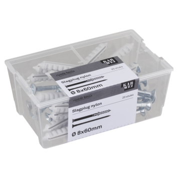 De KARWEI Slagplug nylon Ø 8x60mm met schroef is geschikt voor toepassing op verschillende soorten materialen zoals beton, wandverbinding en metaal. Nagelpluggen zijn zeer geschikt voor het monteren van houten regelwerk (zoals plinten). De werkwijze is anders dan bij een gewone plug en daarom is deze plug ook wel bekend als spijkerplug of nagelplug. Je slaat de plug namelijk met een hamer in het boorgat. Gebruik voor het boren van het gat een boor met een doorsnede van 8mm. De plug is 60mm lang. Bijpassende schroeven zijn 65mm lang en hebben een doorsnede van Ø 4,8 mm. Een verpakking bevat 20 slagpluggen.