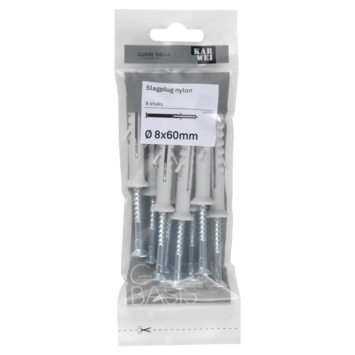 De KARWEI Slagplug nylon Ø 8x60mm met schroef is geschikt voor toepassing op verschillende soorten materialen zoals beton, wandverbinding en metaal. Nagelpluggen zijn zeer geschikt voor het monteren van houten regelwerk (zoals plinten). De werkwijze is anders dan bij een gewone plug en daarom is deze plug ook wel bekend als spijkerplug of nagelplug. Je slaat de plug namelijk met een hamer in het boorgat. Gebruik voor het boren van het gat een boor met een doorsnede van 8mm. De plug is 60mm lang. Bijpassende schroeven zijn 65mm lang en hebben een doorsnede van Ø 4,8 mm. Een verpakking bevat 8 slagpluggen.