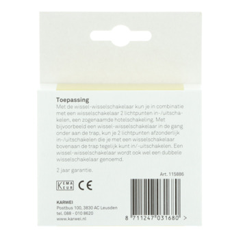 KARWEI Solis wissel-wisselschakelaar antraciet, ook wel dubbele wisselschakelaar genoemd, kan gebruikt worden voor het maken van een hotelschakeling. Gebruik de wissel-wisselschakelaar bijvoorbeeld onder aan de trap, 1 druk op de knop voor het licht in de gang en de andere voor het licht boven. Vervolgens kun je boven het licht weer uitdoen met een wisselschakelaar.