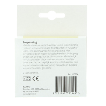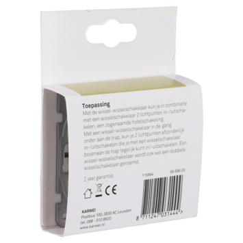 KARWEI Solis wissel-wisselschakelaar wit, ook wel dubbele wisselschakelaar genoemd, kan gebruikt worden voor het maken van een hotelschakeling. Gebruik de wissel-wisselschakelaar bijvoorbeeld onder aan de trap, 1 druk op de knop voor het licht in de gang en de andere voor het licht boven. Vervolgens kun je boven het licht weer uitdoen met een wisselschakelaar.