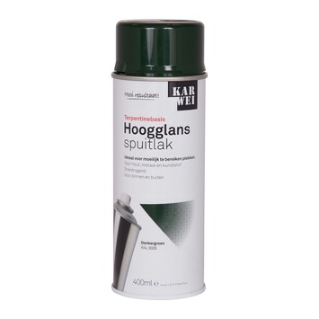 De KARWEI spuitlak hoogglans klassiek groen 400 ml is een duurzame spuitlak met hoge dekkracht. De lak is ideaal voor moeilijk te schilderen oppervlakken zoals buizen, rotan, spijlen en dergelijke. De lak kan gebruikt worden op houtwerk, metaal, harde kunststoffen en keramische materialen. De spuitlak is zowel binnen als buiten te gebruiken en is gemakkelijk te verspuiten. De lak is klassiek groen van kleur en heeft een hoogglanzende afwerking. De spuitbus bevat 400 milliliter, dit is genoeg voor een oppervlakte van zo'n 1,5 tot 2 vierkante meter. De hoogglans spuitlak is ook verkrijgbaar in diverse andere kleuren.