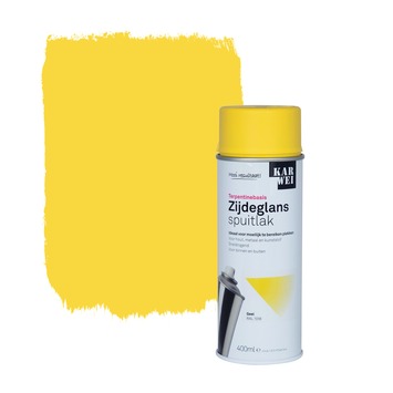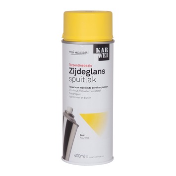 De KARWEI spuitlak zijdeglans geel 400 ml is een duurzame spuitlak met hoge dekkracht. De lak is ideaal voor moeilijk te schilderen oppervlakken zoals buizen, rotan, spijlen en dergelijke. De lak kan gebruikt worden op houtwerk, metaal, harde kunststoffen en keramische materialen. De spuitlak is zowel binnen als buiten te gebruiken en is gemakkelijk te verspuiten. De lak is geel van kleur en heeft een zijdeglanzende afwerking. De spuitbus bevat 400 milliliter, dit is genoeg voor een oppervlakte van zo'n 1,5 tot 2 vierkante meter. De hoogglans spuitlak is ook verkrijgbaar in diverse andere kleuren.