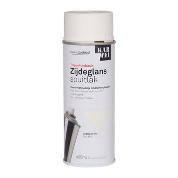 De KARWEI spuitlak zijdeglans gebroken wit (RAL 9010) 400 ml is een duurzame spuitlak met hoge dekkracht. De lak is ideaal voor moeilijk te schilderen oppervlakken zoals buizen, rotan, spijlen en dergelijke. De lak kan gebruikt worden op houtwerk, metaal, harde kunststoffen en keramische materialen. De spuitlak is zowel binnen als buiten te gebruiken en is gemakkelijk te verspuiten. De lak is gebroken wit van kleur en heeft een zijdeglanzende afwerking. De spuitbus bevat 400 milliliter, dit is genoeg voor een oppervlakte van zo'n 1,5 tot 2 vierkante meter. De hoogglans spuitlak is ook verkrijgbaar in diverse andere kleuren.