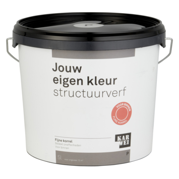 KARWEI Sctructuurverf is een matte muurverf met fijne zandkorrel voor het creëren van structuur. Geschikt voor het duurzaam en decoratief schilderen van muren en plafonds binnenshuis. De zeer goed dekkende verf bedekt kleine oneffenheden, is stootvast en ademend. Eenvoudig aan te brengen en overschilderbaar. Is je muur nog onbehandeld? Gebruik dan voorstrijk structuur en sierpleister voor een optimale hechting.