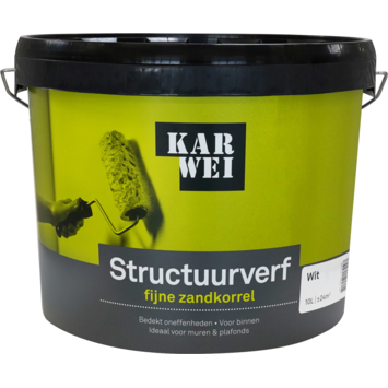 KARWEI structuurverf mat wit 10 liter is een matte muurverf met fijne zandkorrel voor het creëren van structuur. Geschikt als decoratieve afwerklaag op muren en plafonds binnenshuis. De uitstekend dekkende verf bedekt kleine oneffenheden op de ondergrond. Stootvast, ademend, eenvoudig aan te brengen en overschilderbaar. In elke gewenste kleur te mengen.