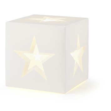 De tafellamp Happy ster wit is een prachtige lamp die uitermate geschikt is voor de kinderkamer. De kubusvormige lamp is wit van kleur en is voorzien van gestanste sterren. Dit geeft de lamp een speels uiterlijk en zorgt ook nog voor een prachtig lichteffect, wat zeker in de smaak valt bij kinderen. Met deze lamp geef je de kinderkamer direct sfeer. De lamp is 18,5 bij 18,5 centimeter groot en heeft een E14 fitting. De lamp wordt geleverd exclusief lichtbron.